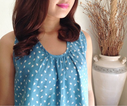 Vカットを少し丸くした雰囲気のU首の襟元の下に少しだけギャザーを寄せて、女性らしいふんわり感を出しています。