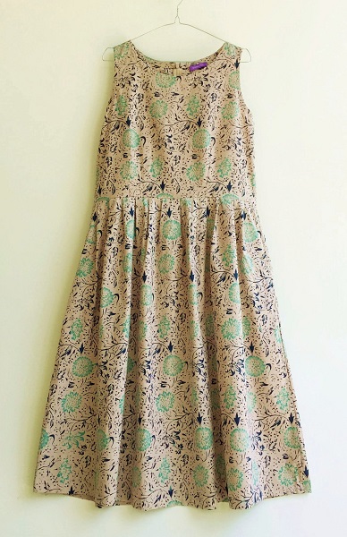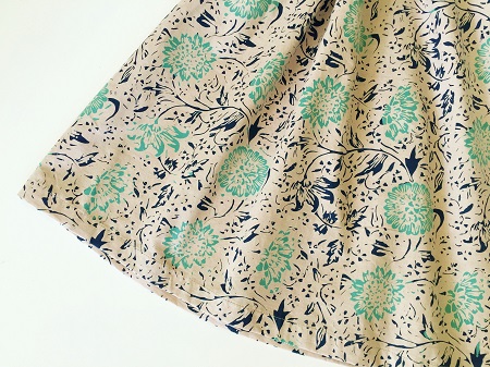 ベージュカラーベースに綺麗なグリーンの花模様と紺の葉模様が入っています。