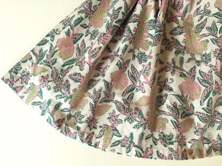 白ベースにグリーン、ピンク、黄緑色の花模様です。