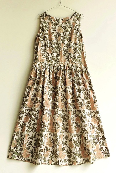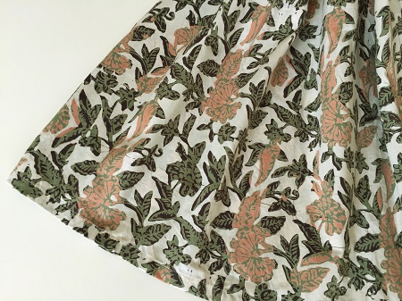 真っ白ではないベースカラーにサーモンピンクの花柄、ブラウンとグリーンのリーフ柄です。
