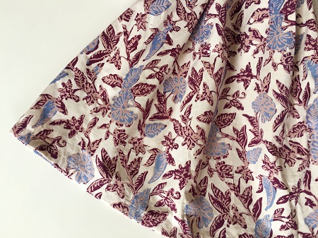 真っ白ではないオフホワイトベースに水色の花柄、ボルドーカラーのリーフ柄です。