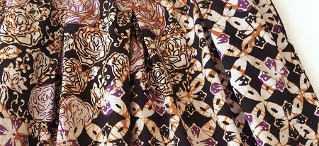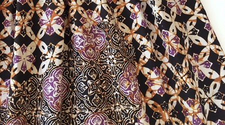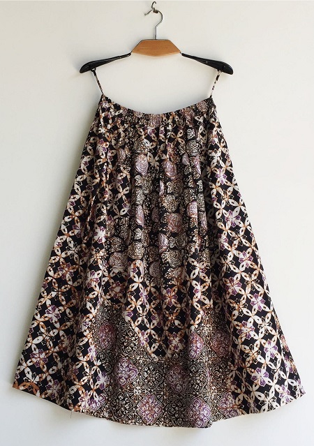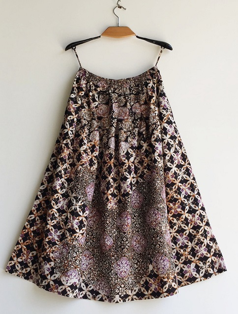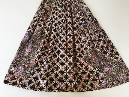 こちらのスカートは3つののチャップ(銅板型押し)モチーフを1枚の生地に押して柄をつけたコンビネーションバティックになります。