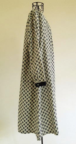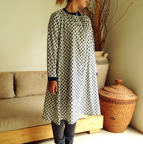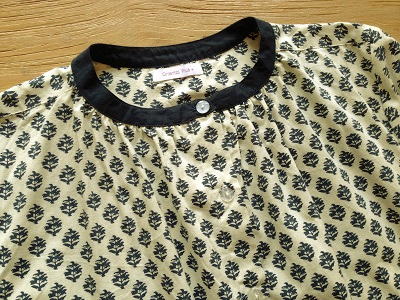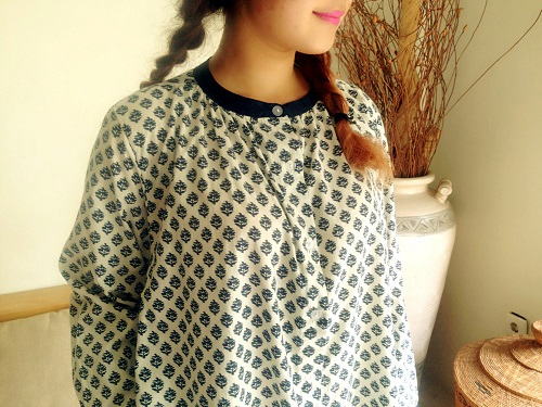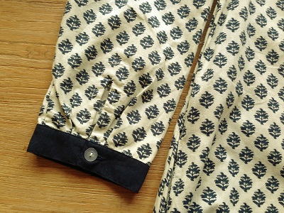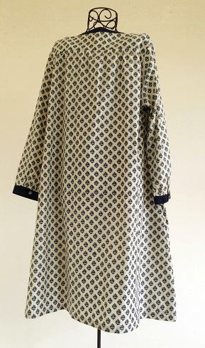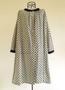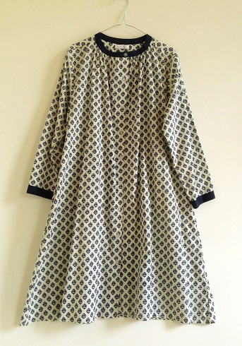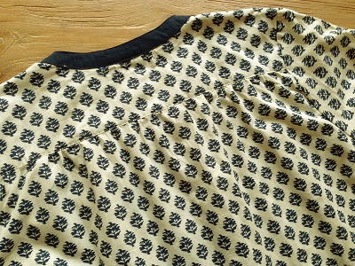 襟元と袖口を紺無地の生地で縁取りした所などちょっとした刺し色になり