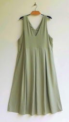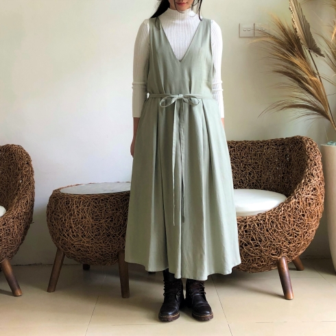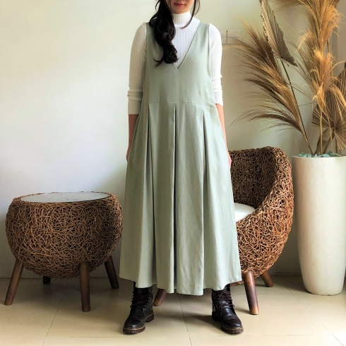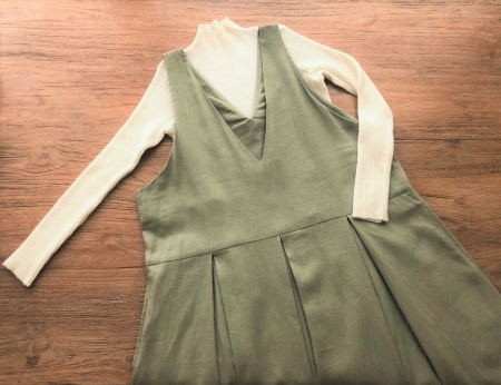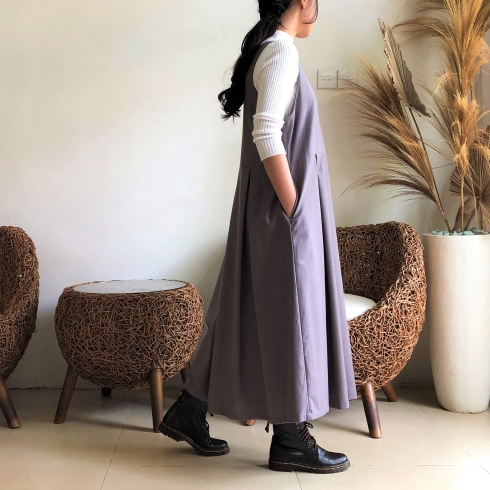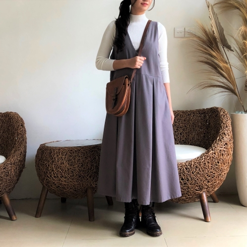 ゆったり、ざっくり着られるサロペットタイプのスカートワンピースです♪ ![]() ![]() ![]() ![]() モデルの身長:163cm 深めVカットの襟元、バックスタイルもVカットになっています。 Vカットなので胸元をスッキリと綺麗に見せてくれます。 ウエストちょうどかややハイウエストの位置に替えがあり、ウエスト切り替え部分からプリーツスカートが広がるデザインです。 ハイネックカットソーやブラウス、ニットやTシャツなど何にでも良く似合います♪ 季節感長く着ていただける素材なので、ブーツやスニーカーを合わせて長いシーズン楽しんでいただけたら幸いです。いろいろなアレンジでお楽しみください♪