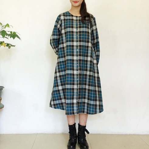丸襟に裾までボタンがついています。 形は広めのAラインに広がるシンプルなデザインのワンピースです。