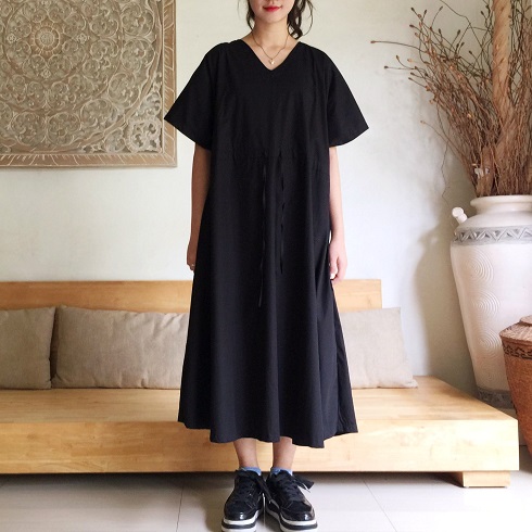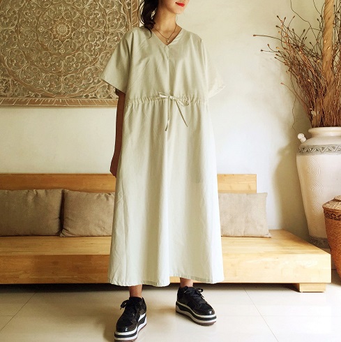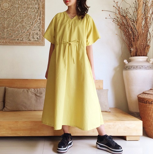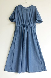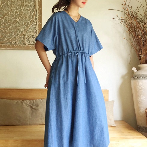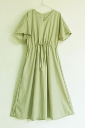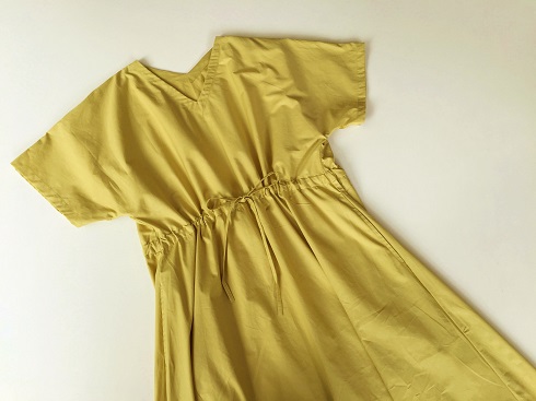 Vカットの襟元で顔回りをスッキリと、またウエスト部分に絞れるリボン紐がついています。