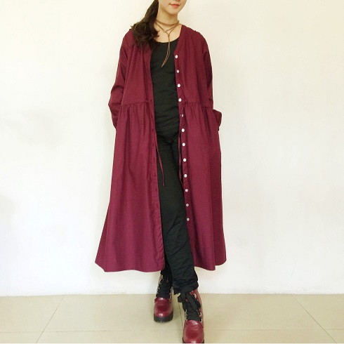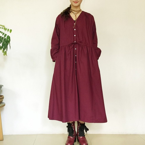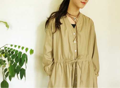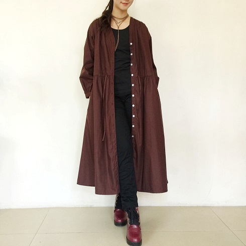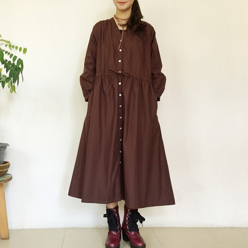 ![]() ![]() スッキリとしたVカットの襟元に裾まで前ボタンのロング丈。 ウエスト切り替え部分に絞れるリボン紐がついています。 スカート左右にあると便利なポケットもついています。 ウエストのリボンはお好みで調節可能です。 ギュッとリボンを絞ってウエストにポイントを置いたり、 逆にリボンを絞らずにルーズにストンとした雰囲気で着ていただいても素敵です。 裾まで前ボタンなので羽織として着ていただいても可愛いく、いろいろなスタイルにアレンジがとても楽しいワンピースです♪ 是非お試しください。 |