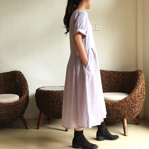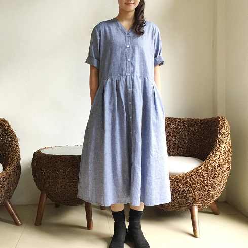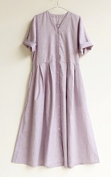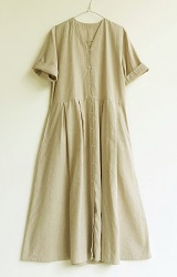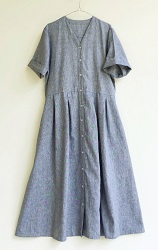 ナチュラルな雰囲気のあるシャンブレー素材。 シンプルな形の前ボタン、長め半袖のワンピースです。