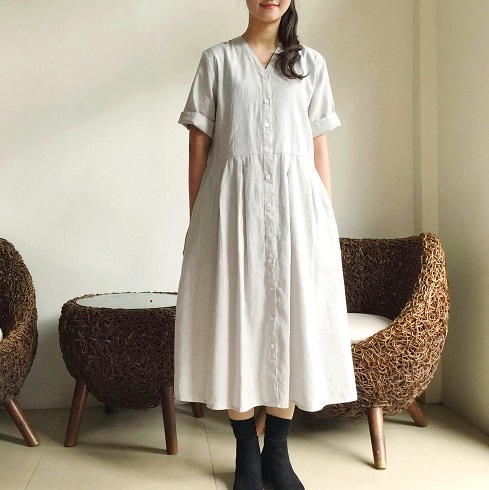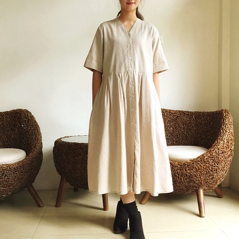 スッキリとしたVカットの襟元に、裾までの前ボタンです。