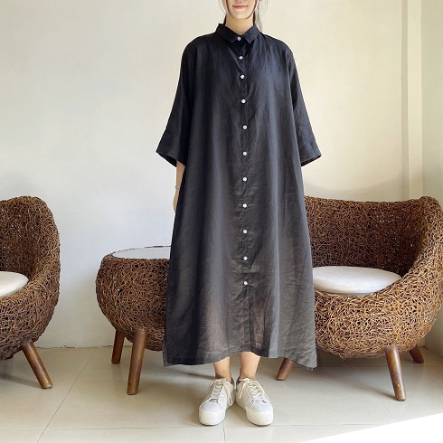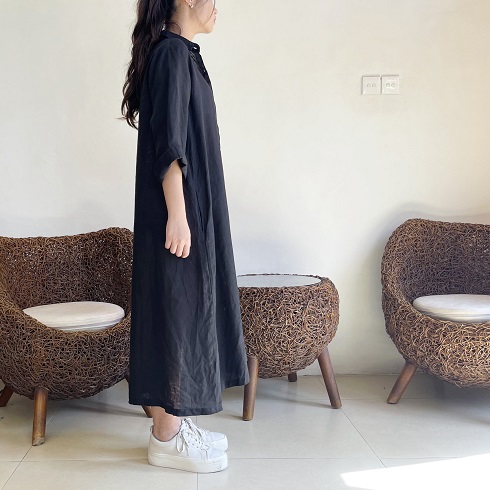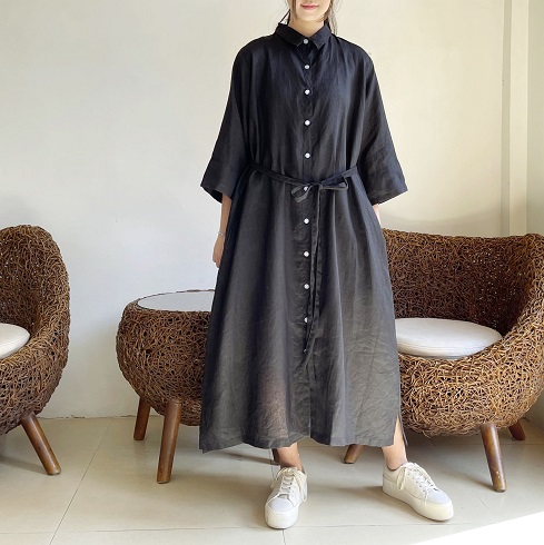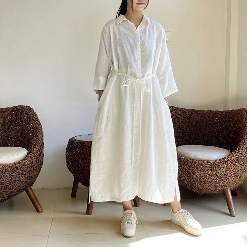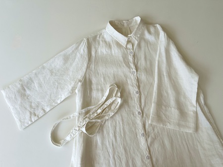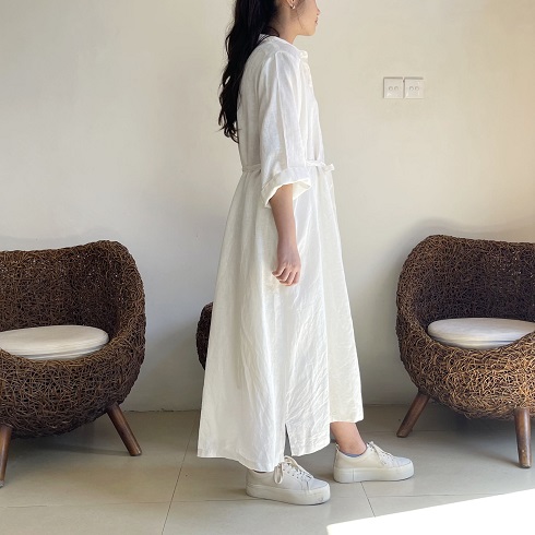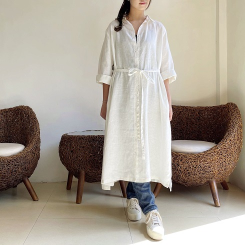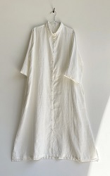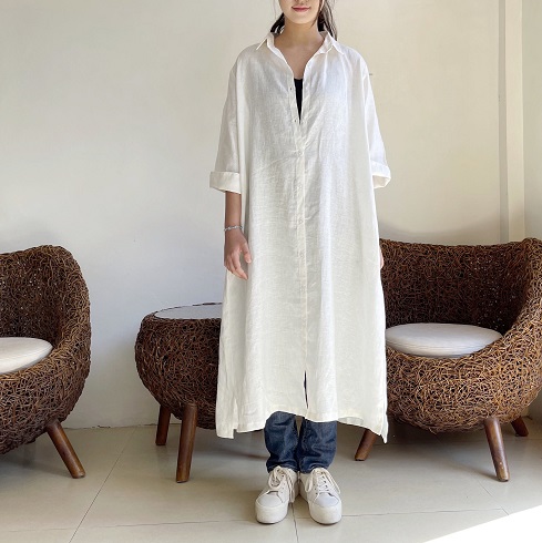 さらりとして涼し気なリネン素材。 ロングシャツとして、リボンを結んでワンピースのように、また羽織りにしたりとアレンジの楽しいシャツワンピースです。 ![]() ![]() ![]() ![]() ![]() ![]() ![]() ![]() 日差しの強い季節にこそ活躍するお袖長めのワンピースです。 小さめの襟に前開きのロングシャツワンピースです。 襟元はややゆったりめのサイズ感になっていますのでボタンをしっかり留めても苦しくなく着ていただけます。 裾まで緩やかに広がるAラインでロング丈になります。 身幅はゆったりとしたサイズ感でざっくりと着ていただけます。 ボタンをきっちり留めても可愛いですし、首元から2~3個開けてルーズな雰囲気で着ていただいても素敵です。また前ボタンを開けて軽めの羽織りとしても使えます。 袖口までゆったりとしていて風通しも良く、1つ2つ折って着ても素敵です。 長袖ではなくやや短めの8~9分袖ほどの長さになります。 |