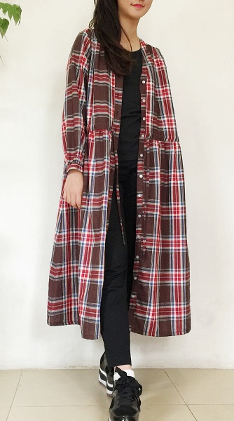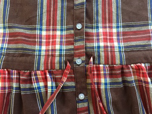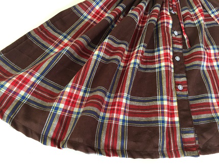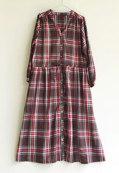 ブラウンベースに赤、青、細く黄色が入ったタータンチェックの柄です。 これ1枚で完成してしまう、オシャレ感のあるワンピース♪