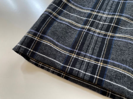 ブラックベースに黄色、白、パープルグレーの細いラインのタータンチェック柄です。