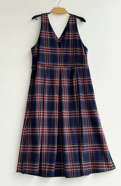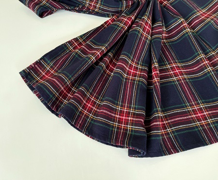 紺ベースに、赤、グリーン、黄色、白の細いラインのタータンチェックです。