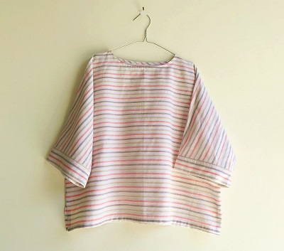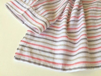 ホワイトベースにコーラルピンク、グレー、ベージュのストライプ柄です。