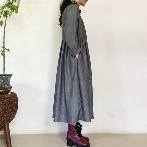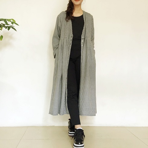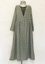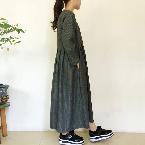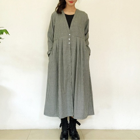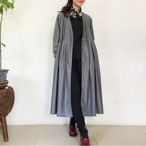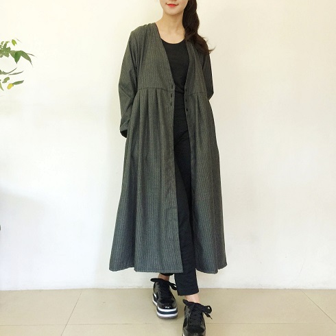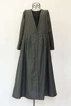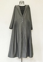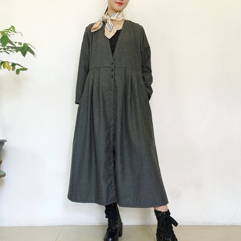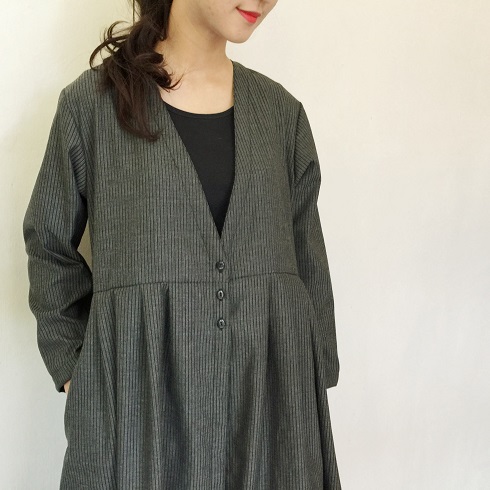 Vカットの深めの襟元に小さなボタンが3つだけついた羽織用のワンピースです。 春や秋の季節の変わり目や、冬の厚手コートになる前に1枚あると便利な羽織物です。