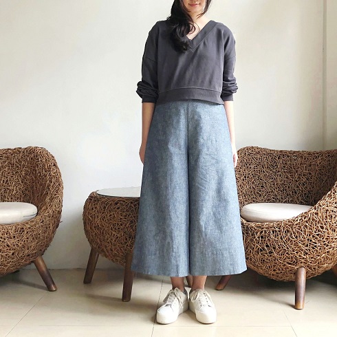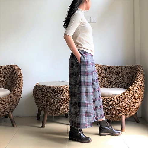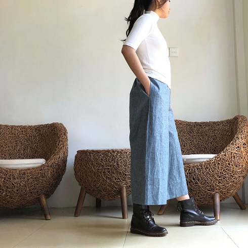 丈感 身長163㎝のモデルがはいた場合、80㎝丈で7分丈、85㎝丈で8分丈ほどになります。 こちらの画像は85㎝丈をはいています。お持ちのパンツの長さと是非比べてみてください。 |